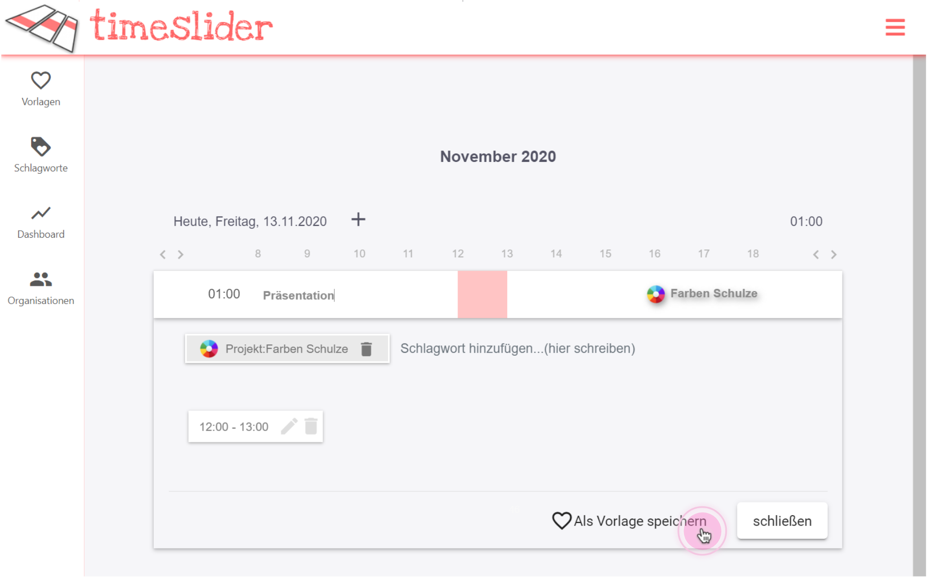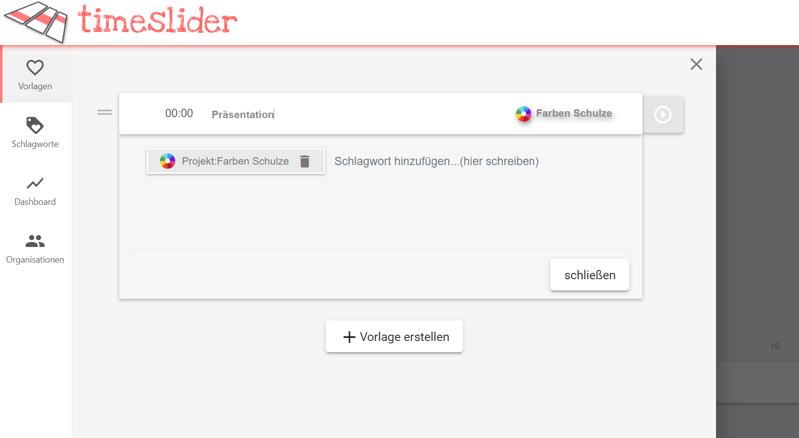 der Schlagworte. Zudem kannst du in einer Vorlage bereits Zeiten definieren, die beim Starten des Timers automatisch übernommen werden.