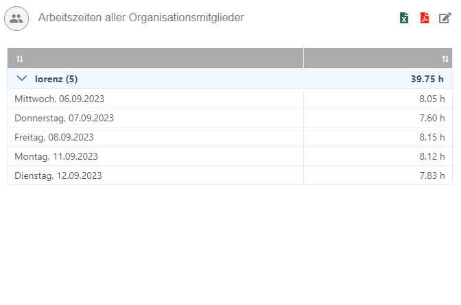 Zu den Arbeitszeiten gibt es auch ein entsprechendes Widget, welches die erfassten Arbeitszeiten der Mitarbeiter in einer Liste zusammenfasst.